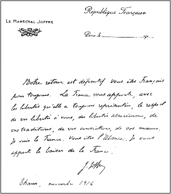 Am 24. November 1914 begab sich General Joffre in die von der französischen Armee besetzte elsässische Stadt Thann. Er gab eine Erklärung ab, die sich an Frankreich und seine Verbündeten richtete.
