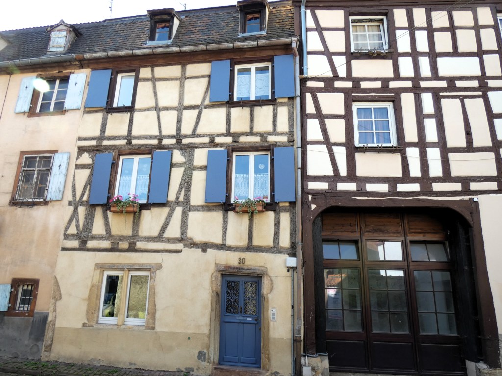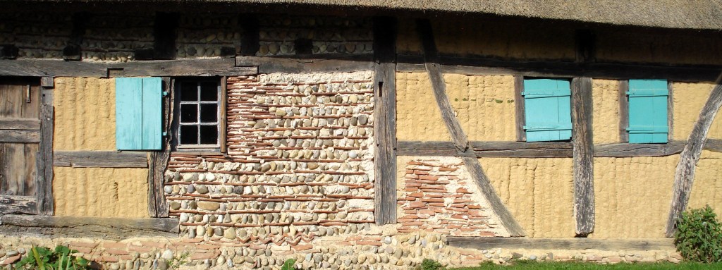 L’espace entre les colombages était comblé d’un torchis à base de chaux tenant sur une armature de branches. D’autres matériaux comme des briques de torchis, de galets du Rhin ou de vieilles tuiles pouvaient combler les ouvertures. Pour protéger la maison de l’humidité, un enduit à base de chaux, coloré dans la masse était appliqué sur les murs.